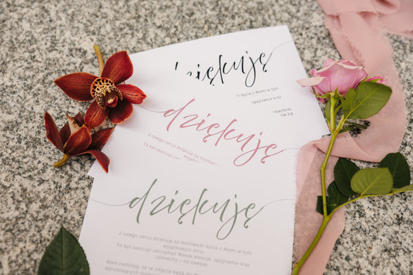 Minimalistyczne podziękowanie drukowane na matowym papierze w formacie 13x18 cm to piękny sposób, by zamknąć współpracę z klasą i wdzięcznością. Możesz je dołączyć do paczki z odbitkami lub umieścić przy fotoalbumie – niech klient poczuje się naprawdę doceniony.